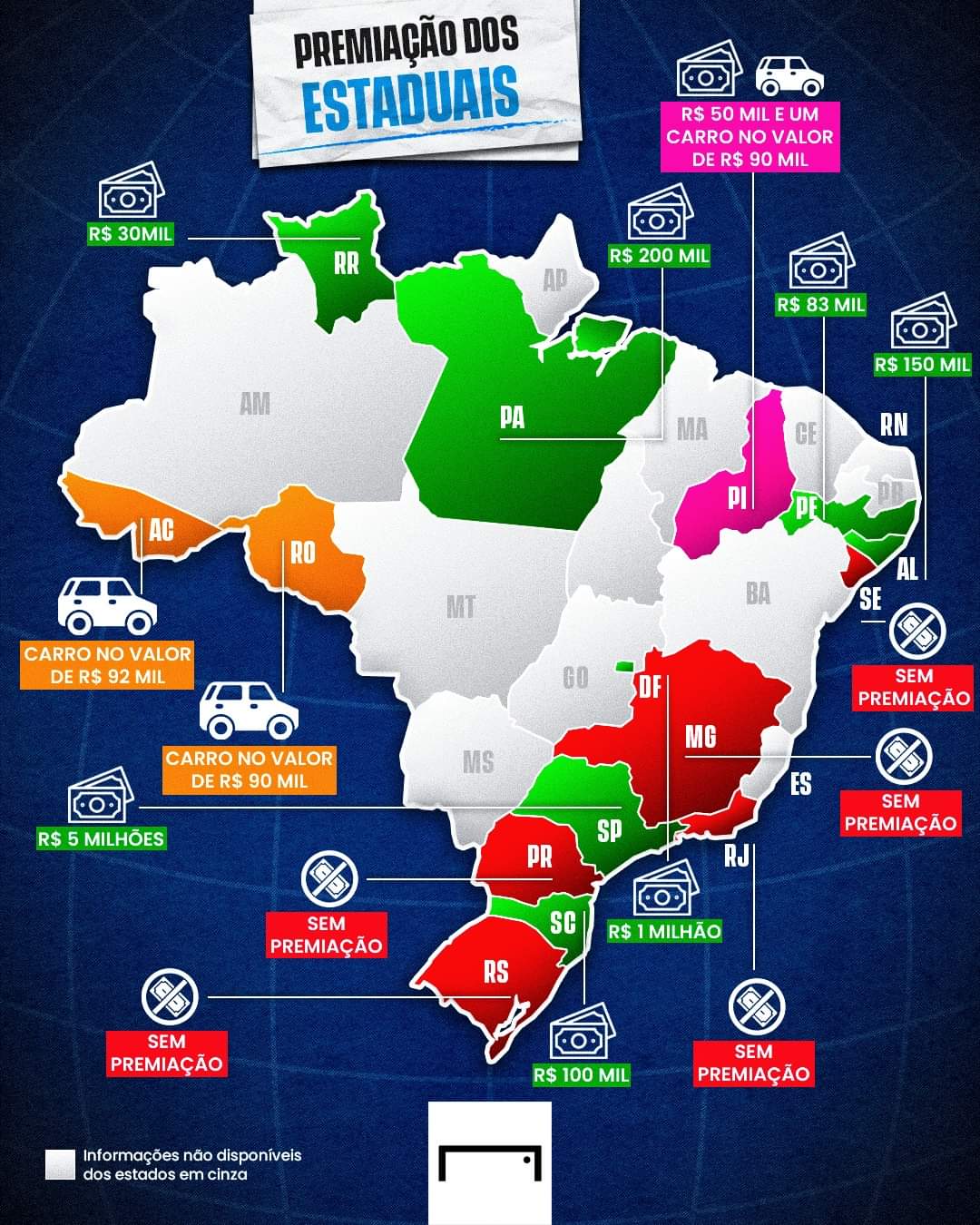 No RJ, RS, MG e SE não há premiação nenhuma. Já no MS, GO, MT, BA, MA, CE, PB, AM e AP não houve informações repassadas sobre premiação.