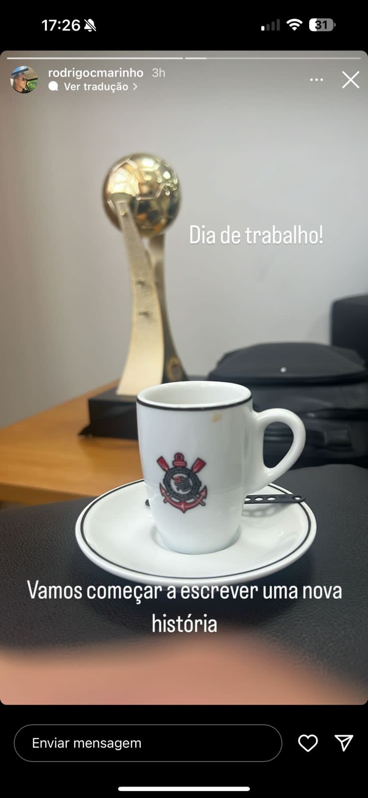 O meia Rodriguinho segue fazendo postagens misteriósas nas redes sociais. Na início da tarde desta segunda-feira (08), o jogador que está quase 1 ano sem jogar futebol profissionalmente, postou em seu story do Instagram uma foto enigmática(abaixo) com uma caneca do Corinthians e as legendas: "Dia de trabalho... Vamos começar a escrever uma nova história", em um local que parece ser uma sala no CT do time paulista.