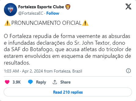 "O Fortaleza repudia de forma veemente as declarações do Sr. John Textor, dono da SAF do Botafogo, que acusa atletas do tricolor de estarem envolvidos em esquema de manipulação de resultados.
