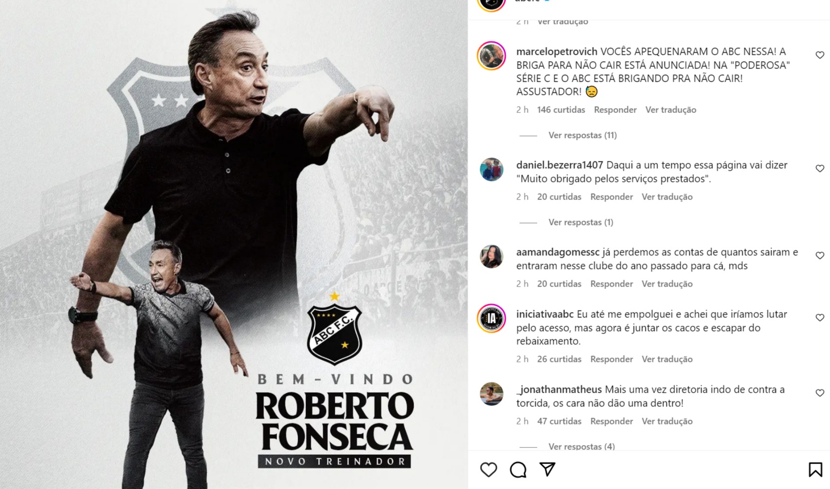 Contudo, nem todos os seguidores que comentaram a postagem, reclamaram da contratação de Roberto Fonseca. Alguns também criticaram a diretoria do ABC, afirmando que o projeto "Série D 2025" estava vivo; e cobrando também mais contratações de jogadores.
