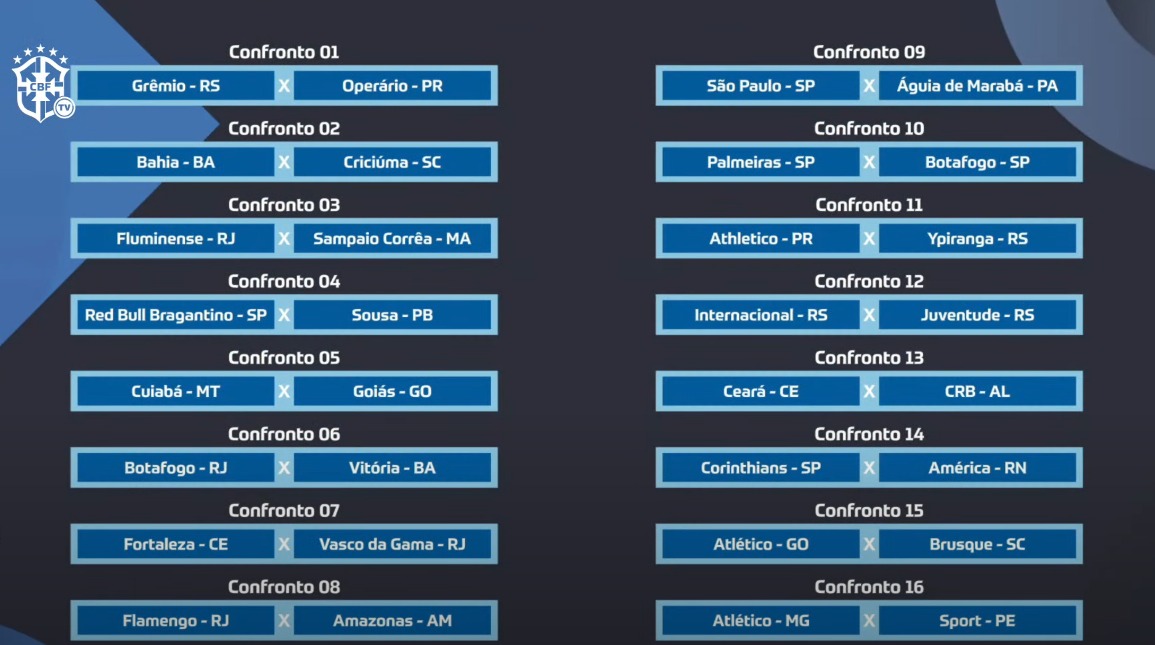 Já o Atlético-MG duela contra o Sport. O Internacional, por outro lado, encontra o Juventude, ao passo que o Grêmio encara o Operário-PR. Um dos representantes do futebol cearense, o Ceará tem como adversário o CRB . Outro representante do nordeste, o Bahia joga frente ao Criciúma. Athletico-PR, Atlético-GO, RB Bragantino e Cuiabá, por fim, têm pela frente respectivamente Ypiranga, Brusque, Sousa-PB e Goiás.