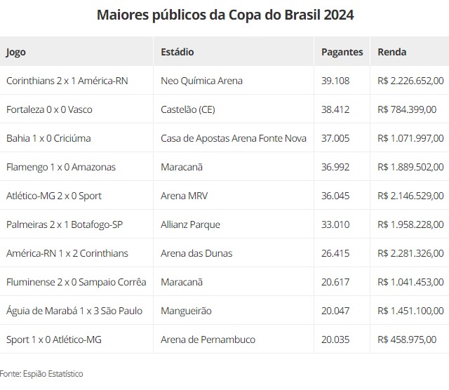 Além dessa partida, clubes nordestinos estão envolvidos em outros seis jogos de maior público. Inclusive, o jogo de ida, entre América e Corinthians na Arena das Dunas. Essa partida, por sinal, tem a maior renda dos 10 primeiros: R$ 2,281 milhões, contra R$ 2,226 do jogo da Neo Química Arena.