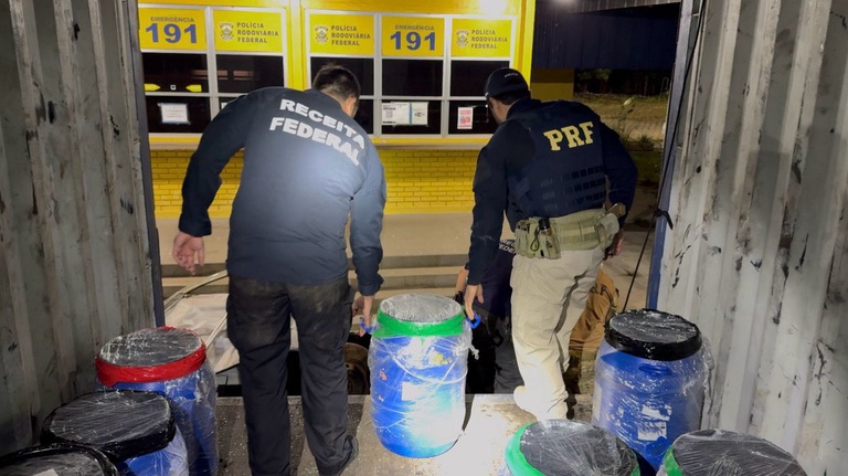 Diante das contradições, os policiais realizaram uma vistoria detalhada no compartimento de carga. Ao fundo da mercadoria declarada, foram encontrados 49 tonéis lacrados contendo aproximadamente 1,5 tonelada de skunk.
