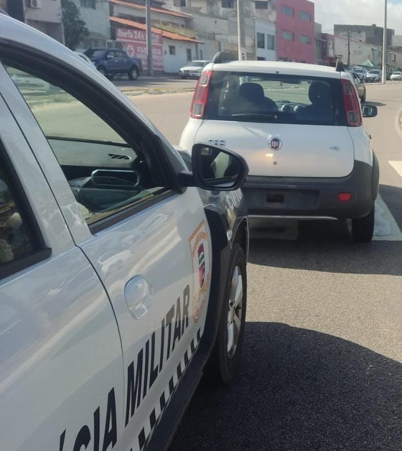 Policiais militares da CIPTUR abordaram um veículo Uno Vivace de cor branca, transitando em direção à Praia do Meio, sem as placas de identificação.