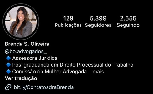 No Instagram, Branda Oliveira tinha mais de 5 mil seguros e um perfil voltado para a advocacia. Além de pos-graduada em Direito Processual do Trabalho, também era integrante da Comissão da Mulher Advogada e assessora jurídica.