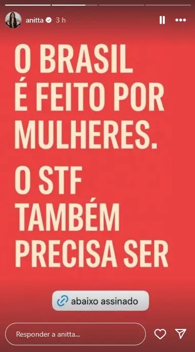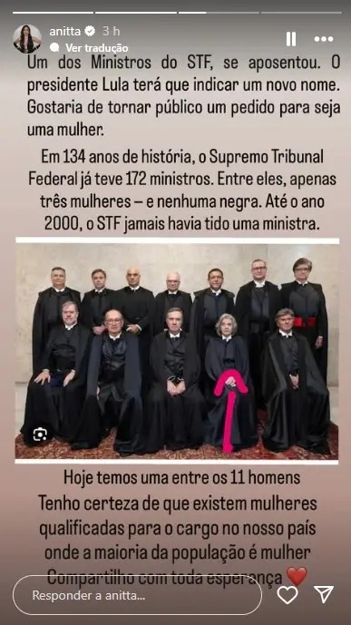 Nesta terça, a cantora usou as redes sociais para pedir que o presidente escolha a quarta mulher — em mais de 130 anos de história do tribunal — a integrar a Corte na vaga aberta com a aposentadoria do ministro Luís Roberto Barroso.