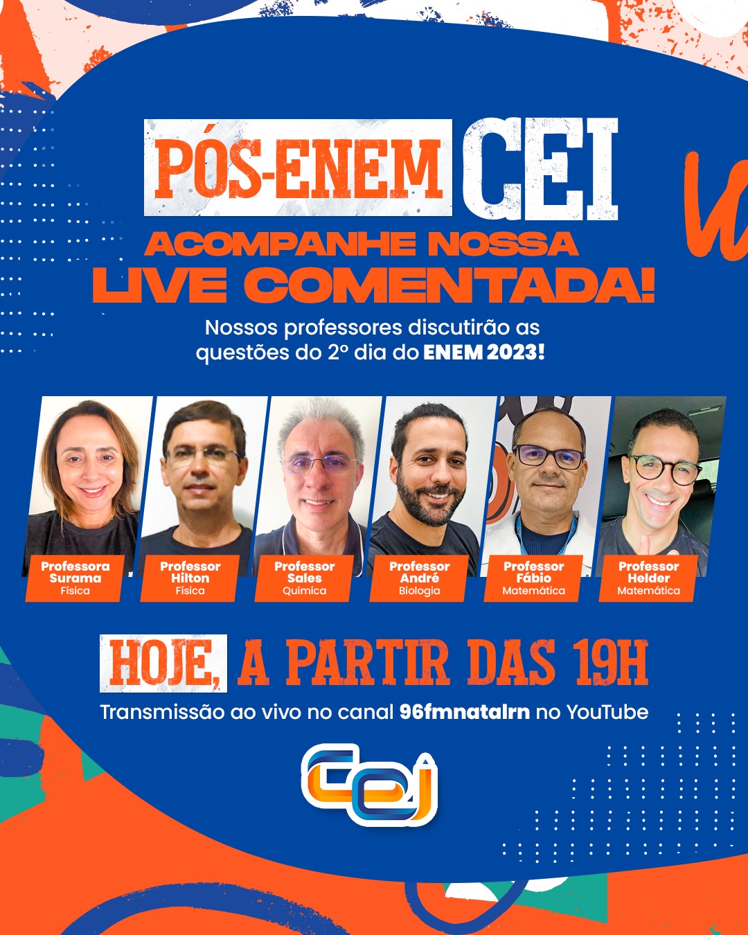 Está tudo pronto! Neste domingo (12), tem live do Colégio CEI e da 96 FM para os comentários do segundo dia de prova do Exame Nacional do Ensino Médio (Enem). Salve o horário e assista ao vivo o melhor "pós-prova" do RN, com a equipe mais capacitada e preparada para analisar a prova.
