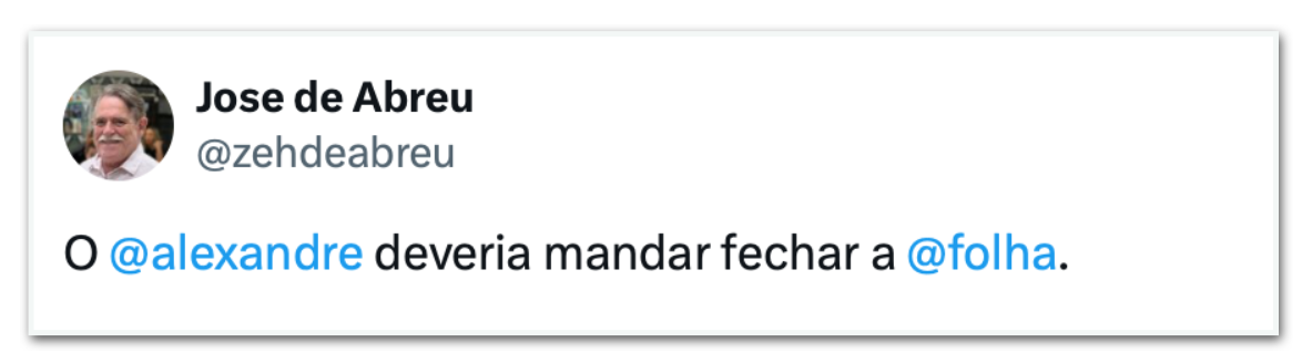 O ator global José de Abreu reapareceu com muita raiva no X, antigo Twitter, nesta terça-feira, para comentar as notícias da Folha de São Paulo sobre o ministro do STF (Supremo Tribunal Federal), Alexandre de Moraes. Abreu, inclusive, defendeu que o jornal deveria "fechar".