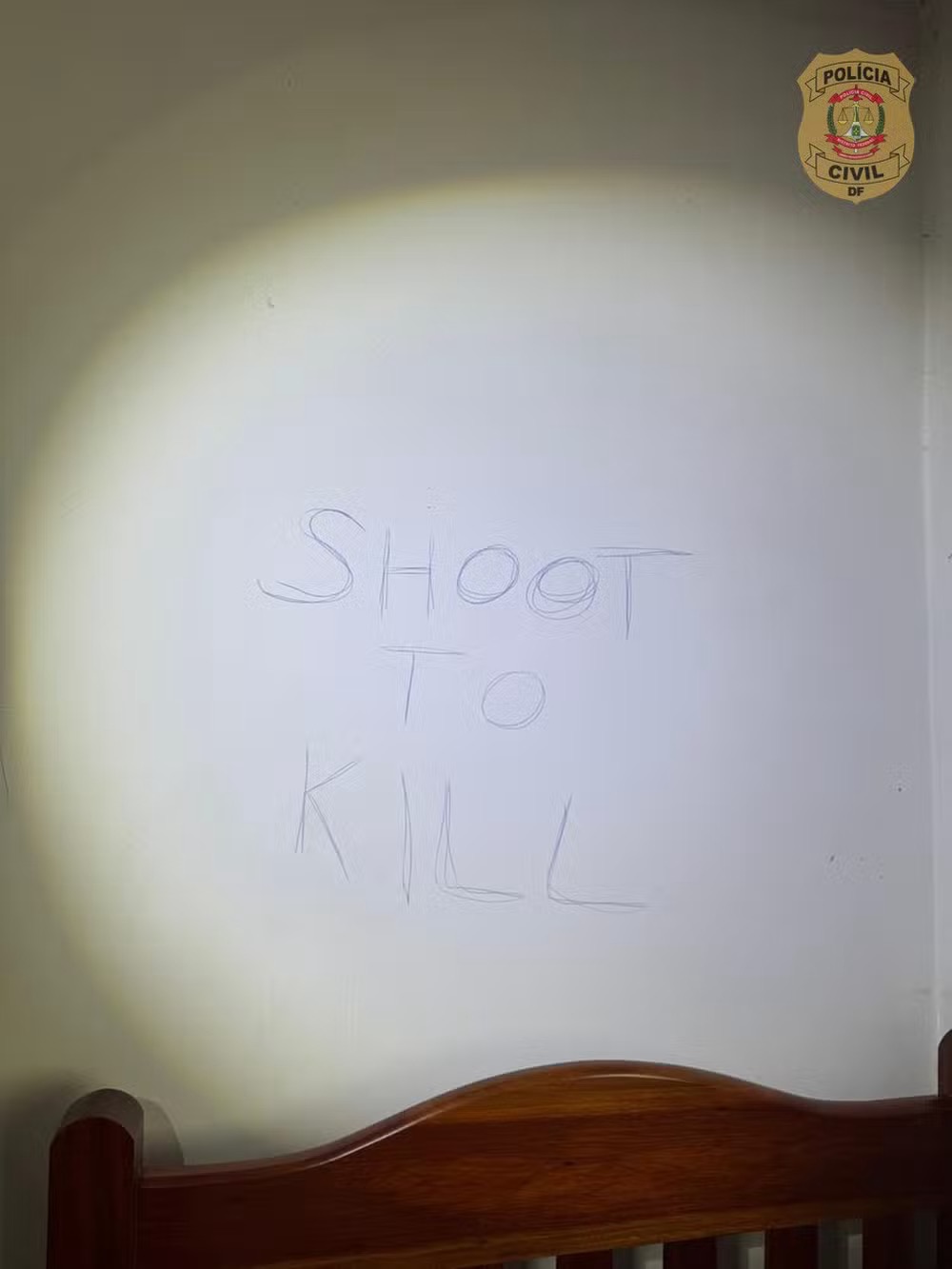 A polícia também encontrou uma parede rabiscada com os dizeres “shoot to kill” (atirar para matar, tradução livre).