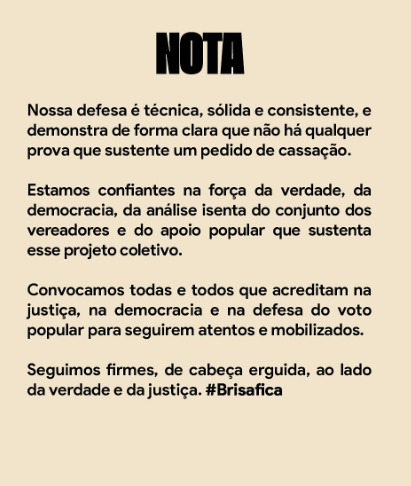 “Seguimos de cabeça erguida ao lado da justiça, da democracia e do apoio popular. Não vamos recuar! #BrisaFica”, escreveu a parlamentar.