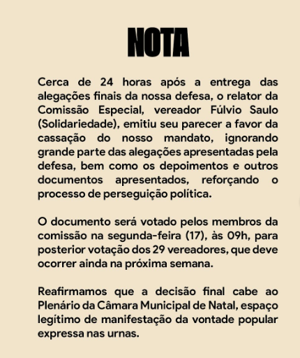 A vereadora de Natal Brisa Bracchi (PT) se pronunciou nas redes sociais sobre relatório que pede a cassação dela. Em publicação feita no Instagram, Brisa afirmou que seguirá firme “ao lado da justiça, da democracia e do apoio popular”.