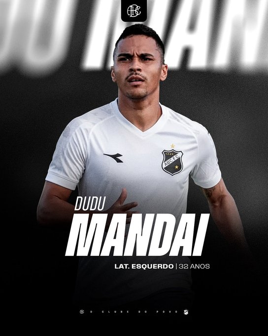 Esse reforço para a ala esquerda é novidade, não tinha sido ventilado por ninguém. A diretoria alvinegra fechou a contratação do lateral-esquerdo Dudu Mandai, 32, que estava no Tombense/MG. O ala tem passagem por vários clubes do Rio Grande do Sul, como Caxias/RS, São José/RS, entre outros, além de vestir a camisa do Remo/PA, Santa Cruz/PE, Manaus/AM, Floresta/CE e Rio Branco/AC. Na carreira, conquistou o Campeonato Acreano 2015 com o Rio Branco/AC e o Campeonato Amazonense 2021 com o Manaus/AM. Acertou contrato que se encerra ao final da Série D.