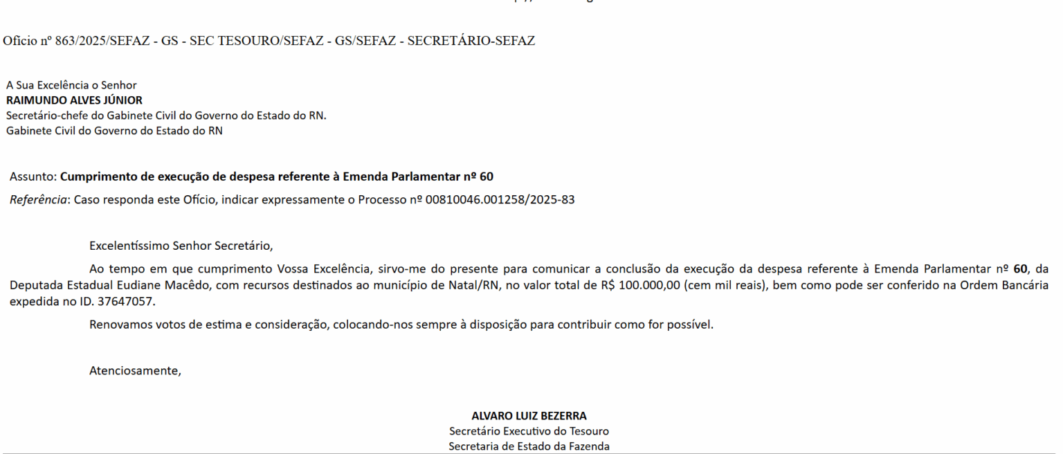 O Governo Fátima liberou uma emenda de R$ 100 mil da deputada Eudiane Macedo para investimentos em Natal. A confirmação do pagamento foi enviada ao Gabinete Civil nessa quinta (13), no mesmo dia em que o relator da comissão especial aberta para processar a vereadora Brisa Bracchi (PT) emitiu parecer opinando pela cassação do mandato da parlamentar. Na Câmara de Vereadores de Natal, Tárcio de Eudiane e Cláudio Custódio são ligados à deputada. A matéria foi produzida pelo Blog do Dina, e vai estar em pauta no programa Jornal das 6 - confira no link abaixo: