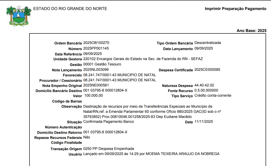 Desde que a despesa da emenda de Eudiane Macedo ficou reconhecida no orçamento, em setembro, não houve mais sinal que os recursos seriam desembolsados. Em 11 de novembro, no entanto, uma ordem bancária foi emitida: