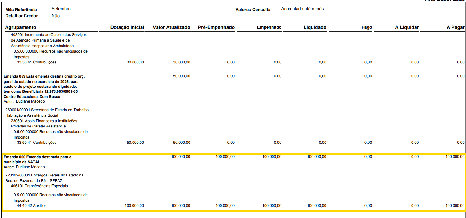 Em setembro, a Emenda 060 foi empenhada e liquidada. Na prática, significa que o governo reconhece o investimento, restando apenas o desembolso financeiro, conforme se visualiza abaixo: