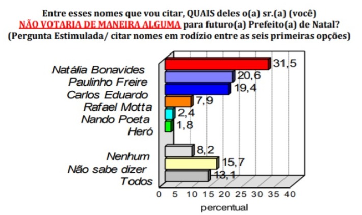 Nesse aspecto, a candidata do PT, Natalia Bonavides, é a mais rejeitada. Ela teve 31,5% dos entrevistados. Paulinho Freire (20,6%) e Carlos Eduardo (19,4%) ocupam a segunda e terceira posição, respectivamente.