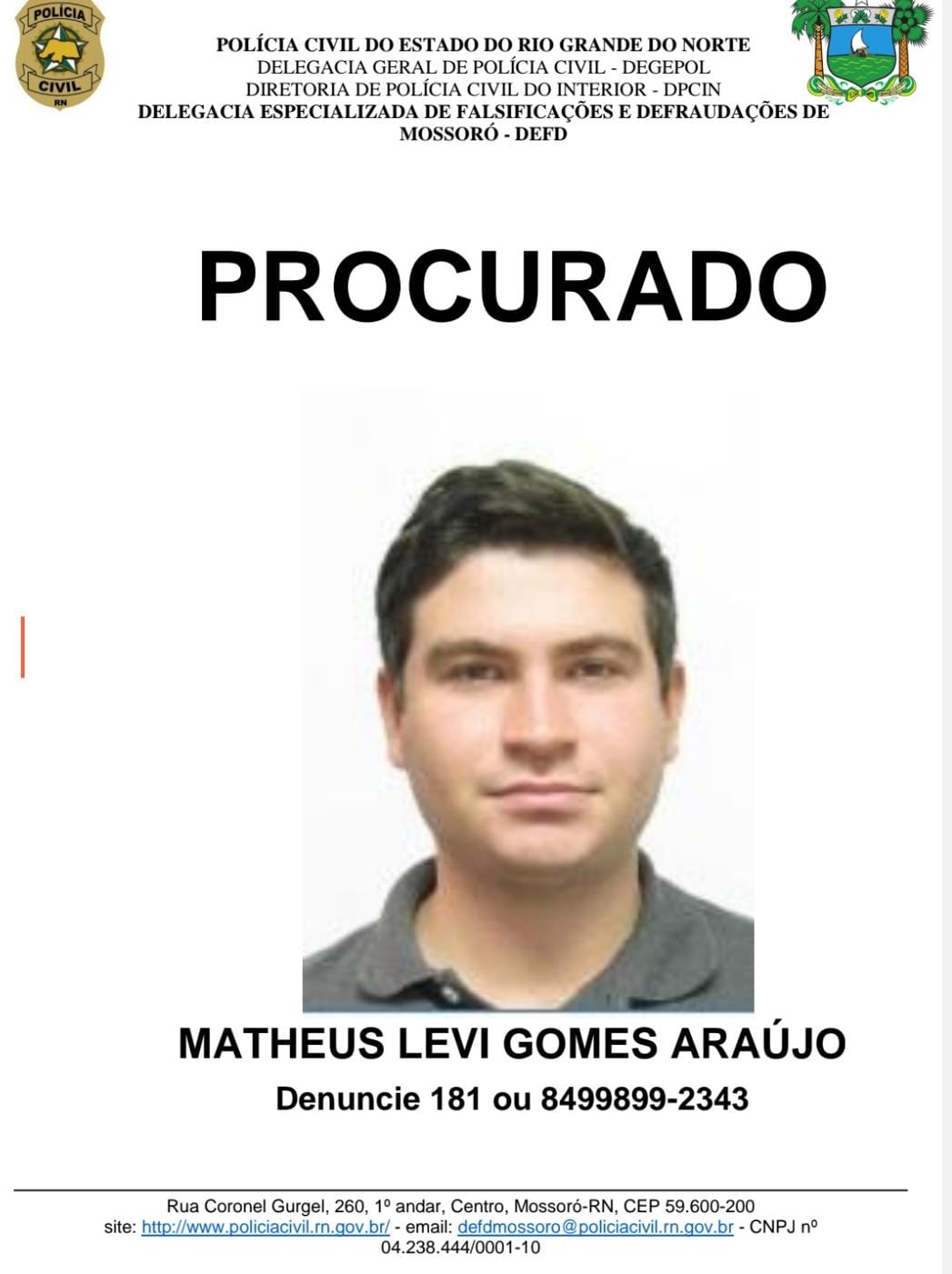 O Inquérito Policial foi concluído, tendo o autor do crime sido indiciado pela Polícia Civil pela prática do crime de estelionato. Ademais, teve sua prisão preventiva decretada pelo Poder Judiciário. O homem é Matheus Levi Gomes de Araújo, de 24 anos, que está foragido.