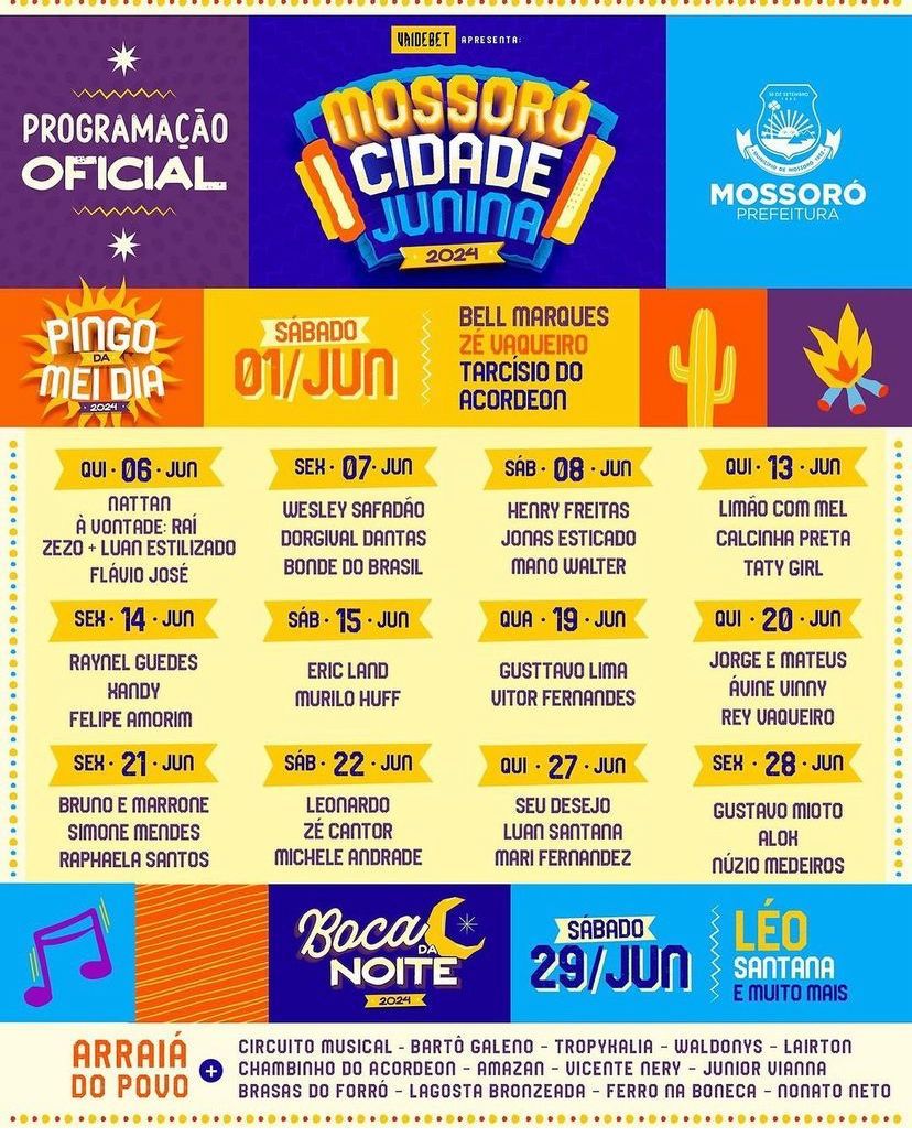 Sem enrolação, a agenda é esta: do Pingo da Mei Dia ao Boca da Noite, todo mundo vai se encontrar no Mossoró Cidade Junina 2024. A abertura do São João mais cultural do Brasil, às 12h do dia 1º de junho, contará com três atrações nacionais: Zé Vaqueiro, Tarcísio do Acordeon e Bell Marques, além de artistas locais que irão animar ainda mais o melhor e maior bloco junino do país.