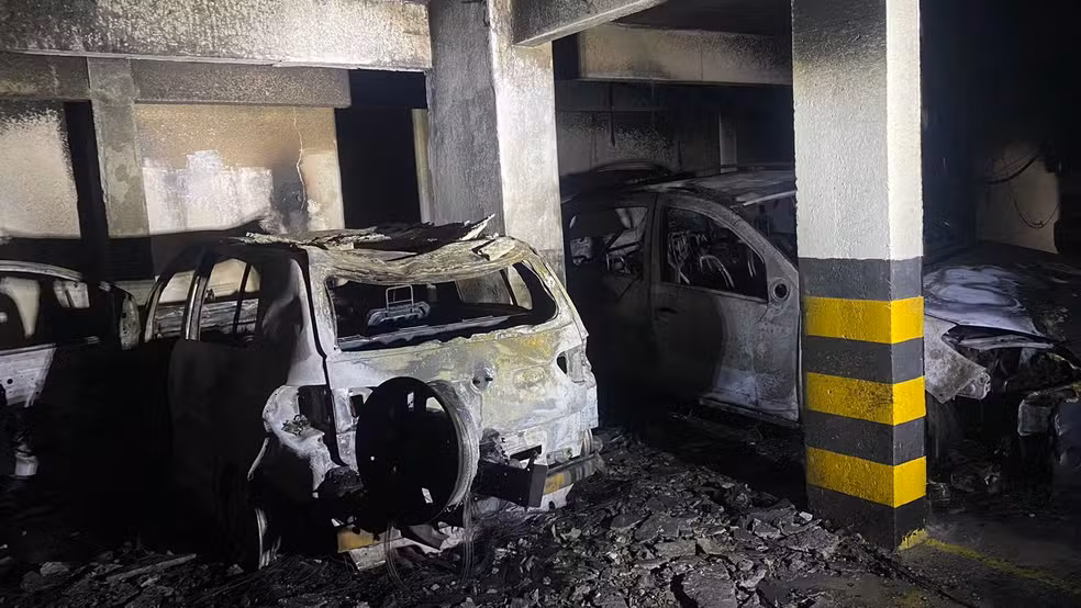 "Ao chegarmos no local, estava todo o estacionamento tomado por fumaça. A gente conseguiu acessar os veículos que estavam pegando fogo e combateu esse incêndio. A fumaça subiu para os andares acima", explicou o tenente Heitor de Medeiros, do Corpo de Bombeiros.