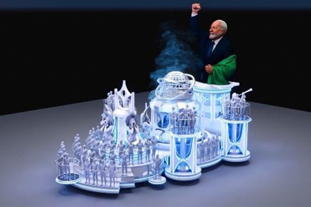 A primeira dama será um dos destaques aa escola. Janja irá desfilar na Sapucaí, em um carro alegórico que terá um boneco gigante representando o presidente Lula. Veja o carro na imagem abaixo.