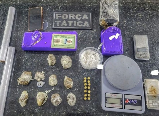 Segundo a PM, a ação ocorreu durante uma incursão no bairro, quando os PMs visualizaram um casal com uma criança tentando fugir. Os indivíduos foram abordados em um terreno próximo e, durante a revista na bolsa que carregavam, foi encontrado um tablete de uma substância esverdeada análoga à maconha.