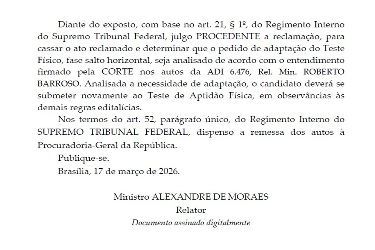 O ministro Alexandre de Moraes, do Supremo Tribunal Federal (STF), decidiu, nessa terça-feira (17), que o candidato goiano com nanismo – Matheus Matos, de 25 anos –, reprovado no teste de salto horizontal do concurso para delegado da Polícia Civil de Minas Gerais (PCMG), terá o direito de ter seu pedido de adaptação do Teste de Aptidão Física (TAF) reavaliado.