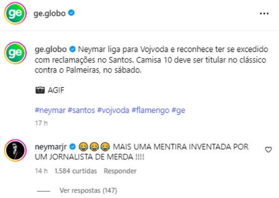 “Mais uma mentira inventada por um jornalista de m…”, respondeu o jogador na publicação do portal no Instagram que afirma que “Neymar conversou por telefone com o técnico Vojvoda e admitiu que exagerou no comportamento esportivo explosivo na derrota para o Flamengo”.