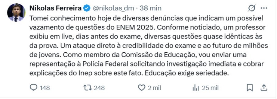 “Tomei conhecimento hoje de diversas denúncias que indicam um possível vazamento de questões do Enem 2025. Conforme noticiado, um professor exibiu em live, dias antes do exame, diversas questões quase idênticas às da prova. Um ataque direto à credibilidade do exame e ao futuro de milhões de jovens. Como membro da Comissão de Educação, vou enviar uma representação à Polícia Federal solicitando investigação imediata e cobrar explicações do Inep sobre este fato. Educação exige seriedade”, afirmou Nikolas.
