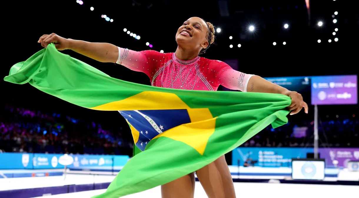 Rebeca Andrade conquistou, neste sábado, a medalha de ouro no Mundial de Ginástica no salto. A brasileira, atual campeã olímpica, superou a norte-americana Simone Biles, que ficou com a prata.