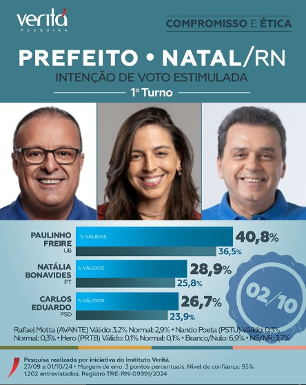 Pesquisa do Institut Veritá apontou Paulinho Freire e Natalia Bonavides no segundo turno em Natal. Carlos Eduardo caiu para terceiro. O levantamento confirma a tendência de queda acentuada do ex-prefeito, confirmando o que o Blog apontava lá atrás: é capaz dele não ir nem para o segundo turno.