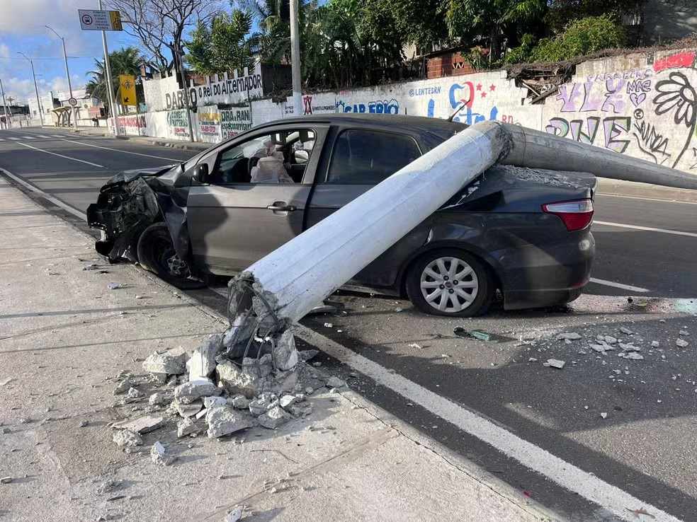 Poste cai sobre carro após colisão em Natal