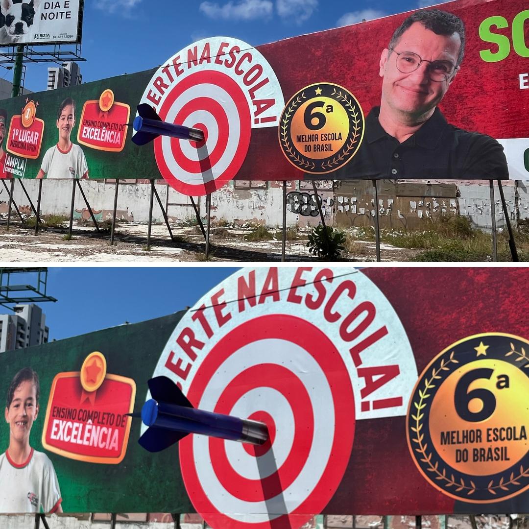 Uma nova peça publicitária tem chamado a atenção de quem circula pela Avenida Senador Salgado Filho, em frente à Igreja Universal. Trata-se de um outdoor triplo, criado pela agência New Comunicação, sob a direção do publicitário Pedro Paulo Bezerra, para o Colégio Ciências Aplicadas. O diferencial? Um aplique inusitado e altamente criativo: um dardo gigante, com cerca de dois metros de comprimento, que literalmente atravessa o outdoor, reforçando o tema da campanha, “Acerte na Escola”.