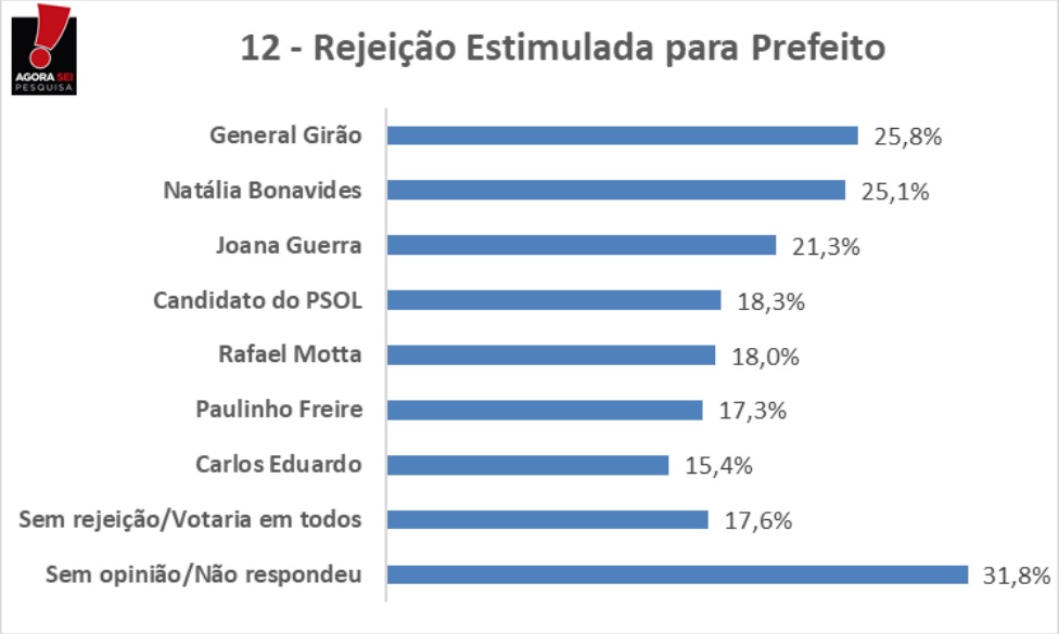 Pelo levantamento, General Girão (PL) é o mais rejeitado, com 25,8%, pouco a frente de Natalia Bonavides (PT), que apareceu com 25,1%. Algo semelhante, inclusive, aconteceu quando o Instituto AgoraSei perguntou aos eleitores se eles votariam em candidatos apoiados por Fátima Bezerra e Jair Bolsonaro - que seriam os dois cabos eleitorais de Natalia e Girão. Veja esse dado clicando aqui.