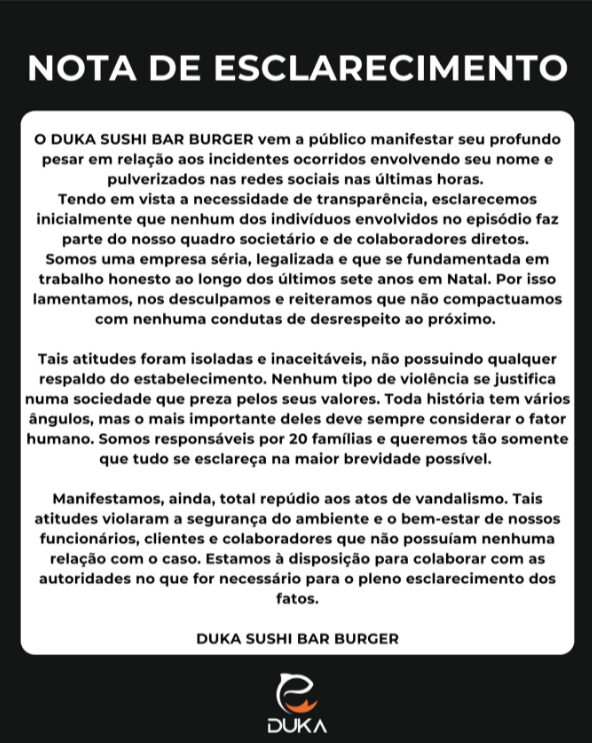 Após a repercussão do caso, o Duka Sushi Bar Burger divulgou uma nota pública.