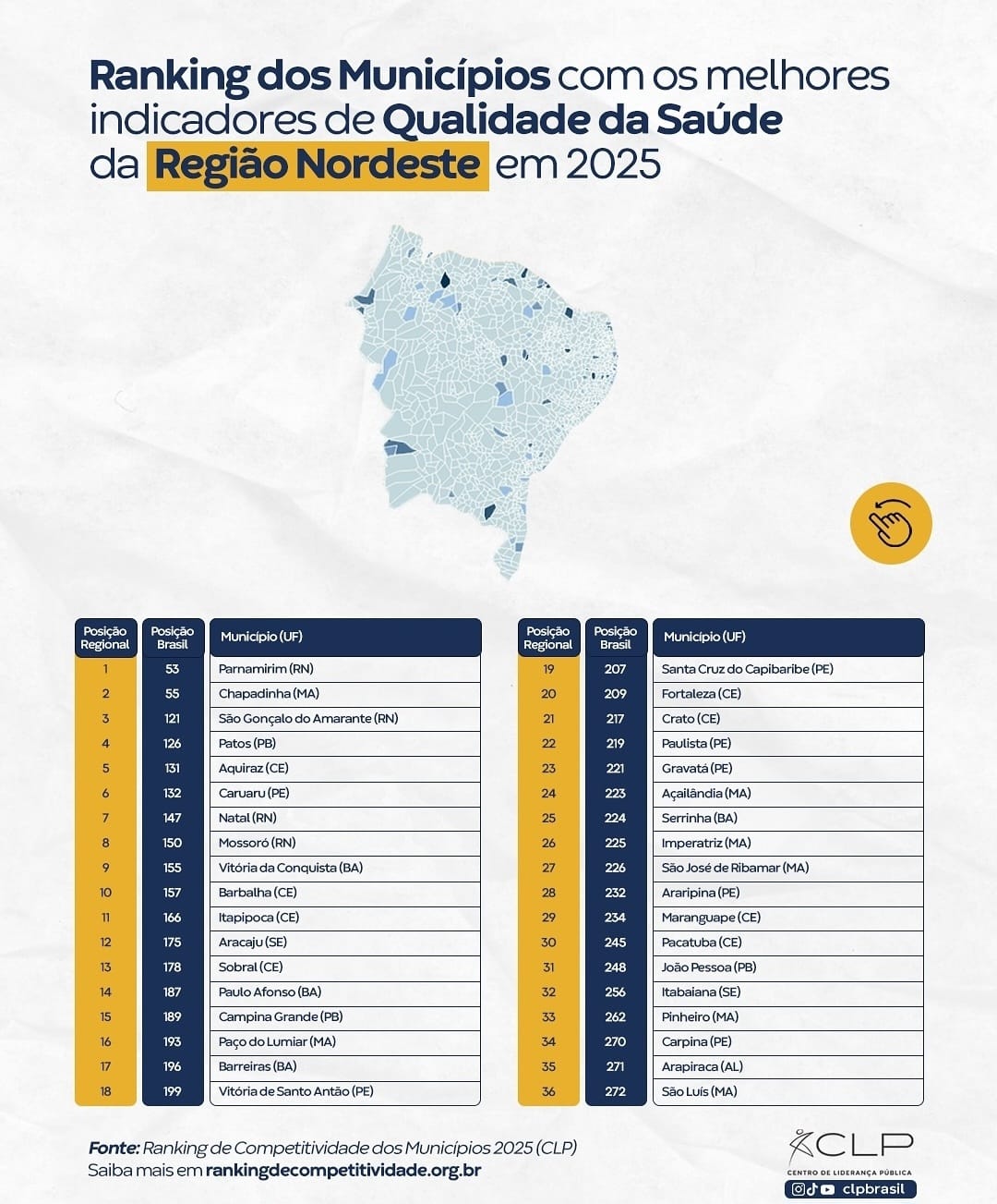 No recorte regional, o município aparece em 3º lugar no Nordeste, avançando nove posições em relação a 2024. Esse salto reflete o impacto das ações estruturantes na atenção primária, programas de vigilância em saúde, ampliação dos serviços e melhoria da gestão no setor.