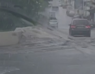 Ponto de alagamento parcialmente transitável na rua Mor Gouveia e Miramar.